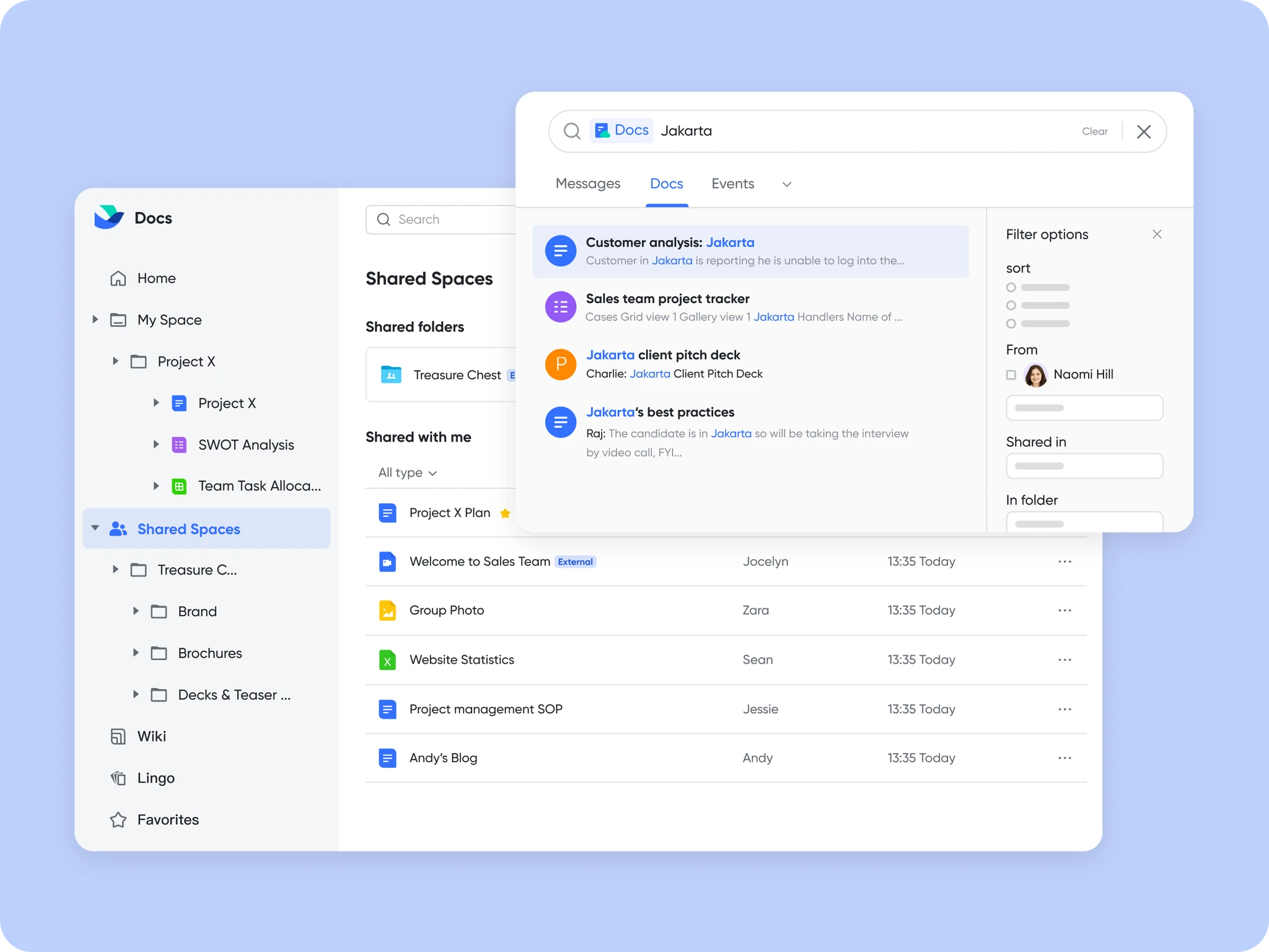 Organize documents in Lark Drive, which supports 200+ file types with cloud storage of 10TB*. Find anything easily and avoid reinventing the wheel.