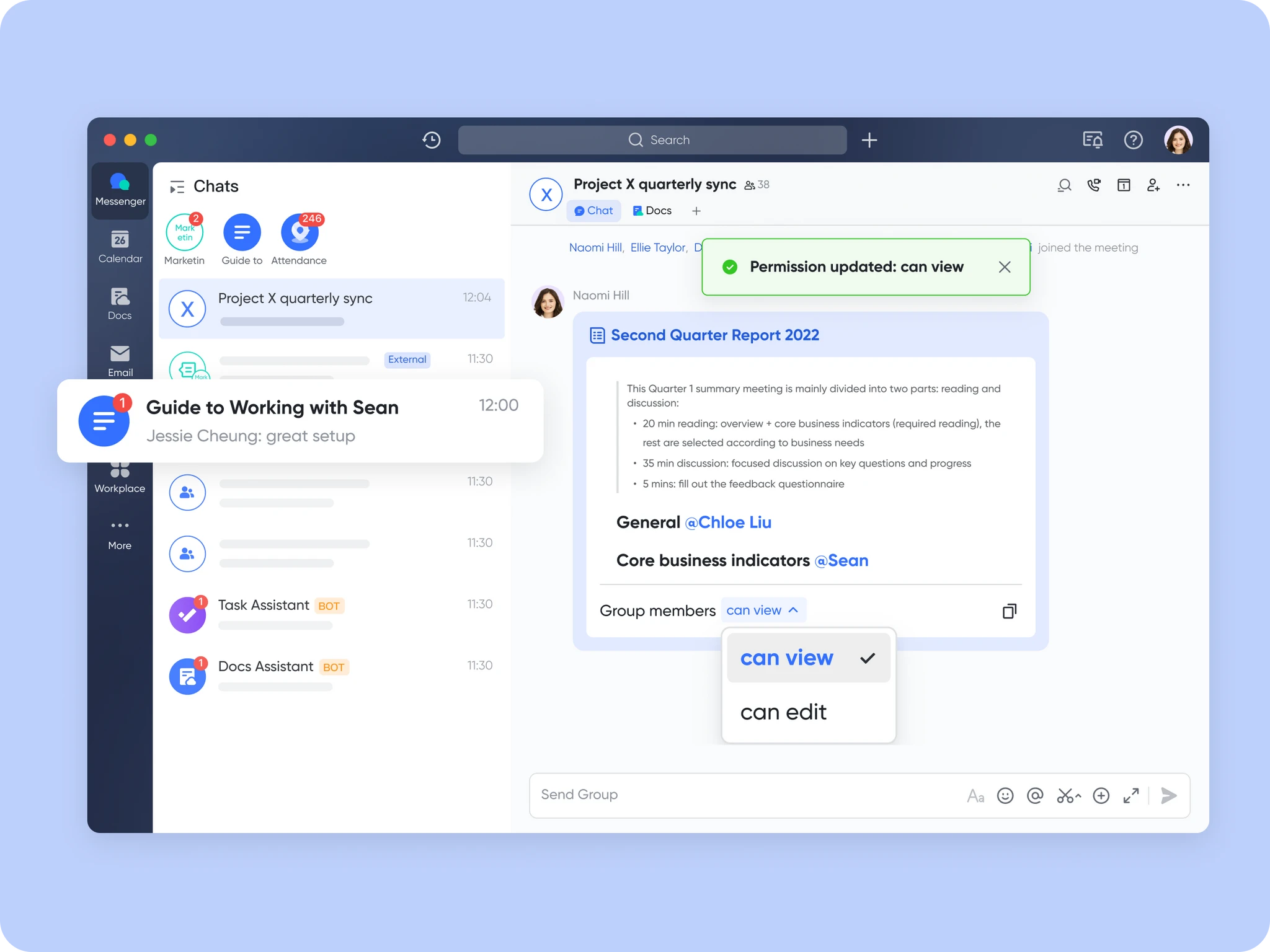 Collaboration is more than co-editing. Share your Docs to Chats, and grant permission with one click. Get notified in chat when someone comments on your Doc, and have focused discussions on specific Doc content.