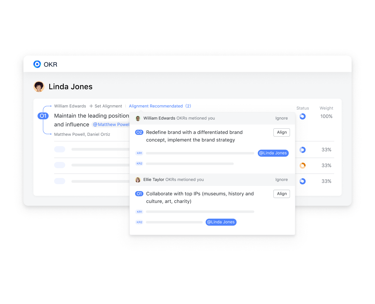 Features such as recommendations on alignment and an alignment view help employees clearly communicate their business focus and collaborate towards the same goal.