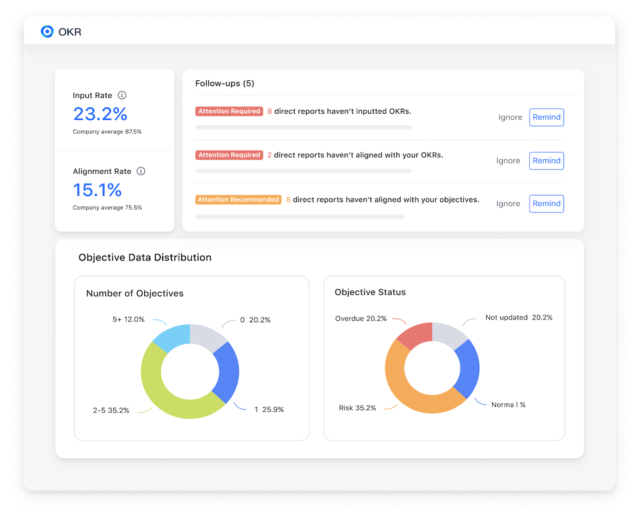 Intuitive OKR data dashboards provide insights on adoption rate, progress, and many other aspects to help team leaders better monitor team achievements, identify potential risks, and motivate the team towards ambitious goals.